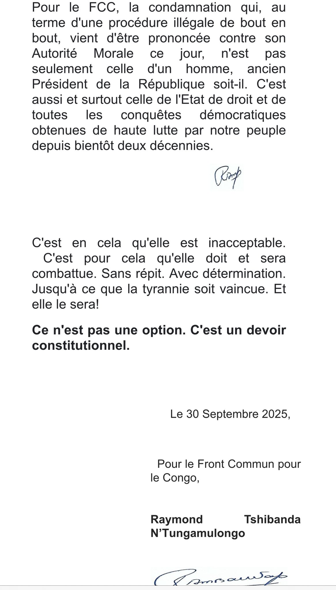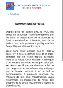 « Depuis près de quatre ans, le FCC n’a cessé de dénoncer – sans être démenti par les faits, la restauration de la dictature et l’instrumentalisation croissante, tant de la justice que de la puissance publique à des fins politiques, dans notre pays. C’est donc sans surprise que le FCC a suivi, il y a peu, le dernier acte de la tragi-comédie qui se jouait depuis quelques mois à la Haute Cour Militaire. Chronique d’un meurtre annoncé, écrite par celui qui, se rêvant en Monarque absolue, a fait le pari de gouverner notre beau et grand pays par la terreur, comme il en a fait la démonstration à plusieurs reprises, de manière de loin plus monstrueuse, avec notamment les massacres de Kilwa, des adeptes de la secte Wazalendo à Goma et bien d’autres. Pour le FCC, la condamnation qui, au terme d’une procédure illégale de bout en bout, vient d’être prononcée contre son Autorité Morale ce jour, n’est pas seulement celle d’un homme, ancien Président de la République soit-il. C’est aussi et surtout celle de l’Etat de droit et de toutes les conquêtes démocratiques obtenues de haute lutte par notre peuple depuis bientôt deux décennies. », peut-on lire dans cette déclaration écrite.
