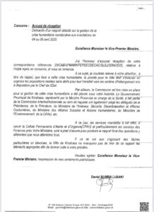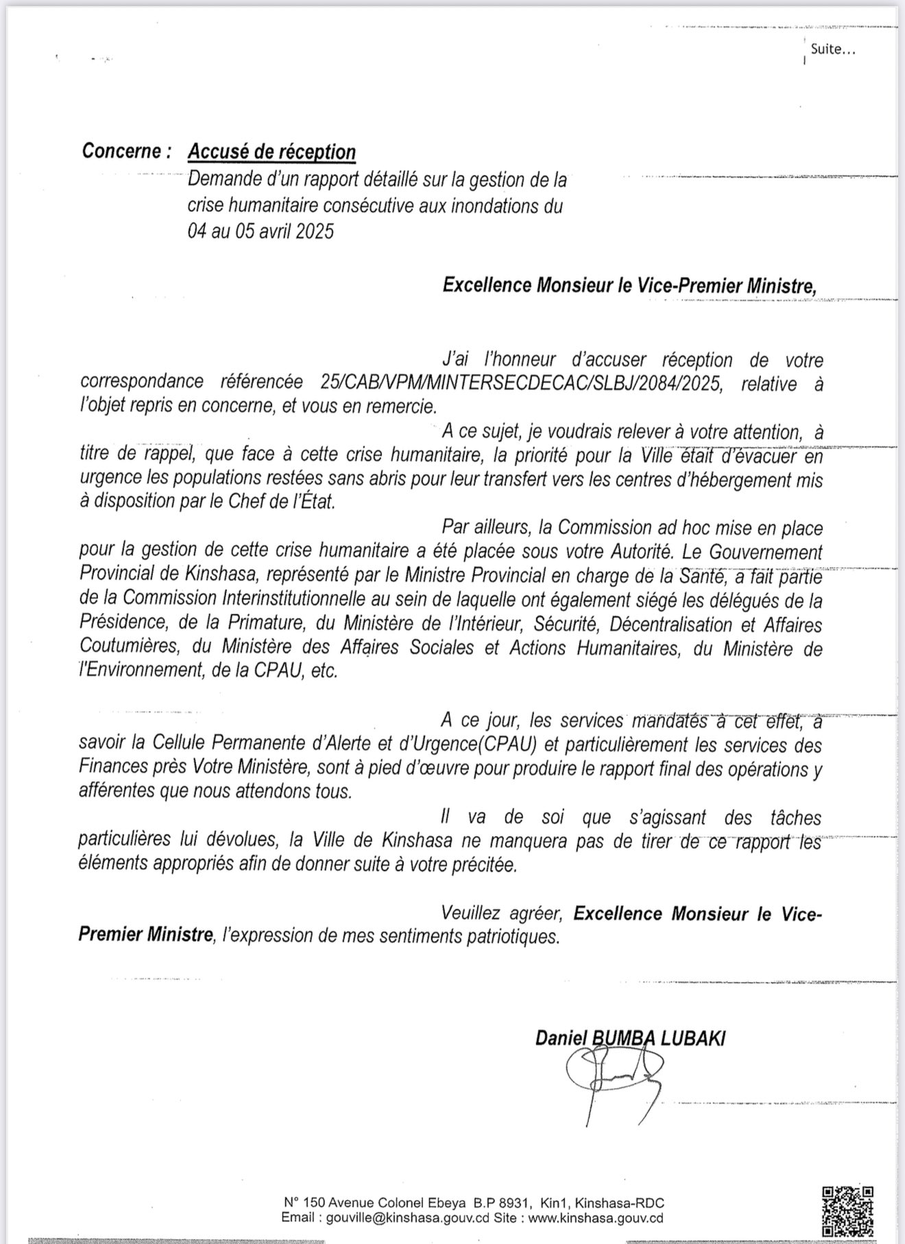 « À ce sujet, je voudrais relever à votre attention, à titre de rappel, que face à cette crise humanitaire, la priorité pour la Ville était d’évacuer en urgence les populations restées sans abris pour leur transfert vers les centres d’hébergement mis à disposition par le Chef de l’État. Par ailleurs, la Commission ad hoc mise en place pour la gestion de cette crise humanitaire a été placée sous votre Autorité. Le Gouvernement Provincial de Kinshasa, représenté par le Ministre Provincial en charge de la Santé, a fait partie de la Commission Interinstitutionnelle au sein de laquelle ont également siégé les délégués de la Présidence, de la Primature, du Ministère de l’Intérieur, Sécurité, Décentralisation et Affaires Coutumières, du Ministère des Affaires Sociales et Actions Humanitaires, du Ministère de l’Environnement, de la CPAU, etc. », peut-on lire dans ce document.