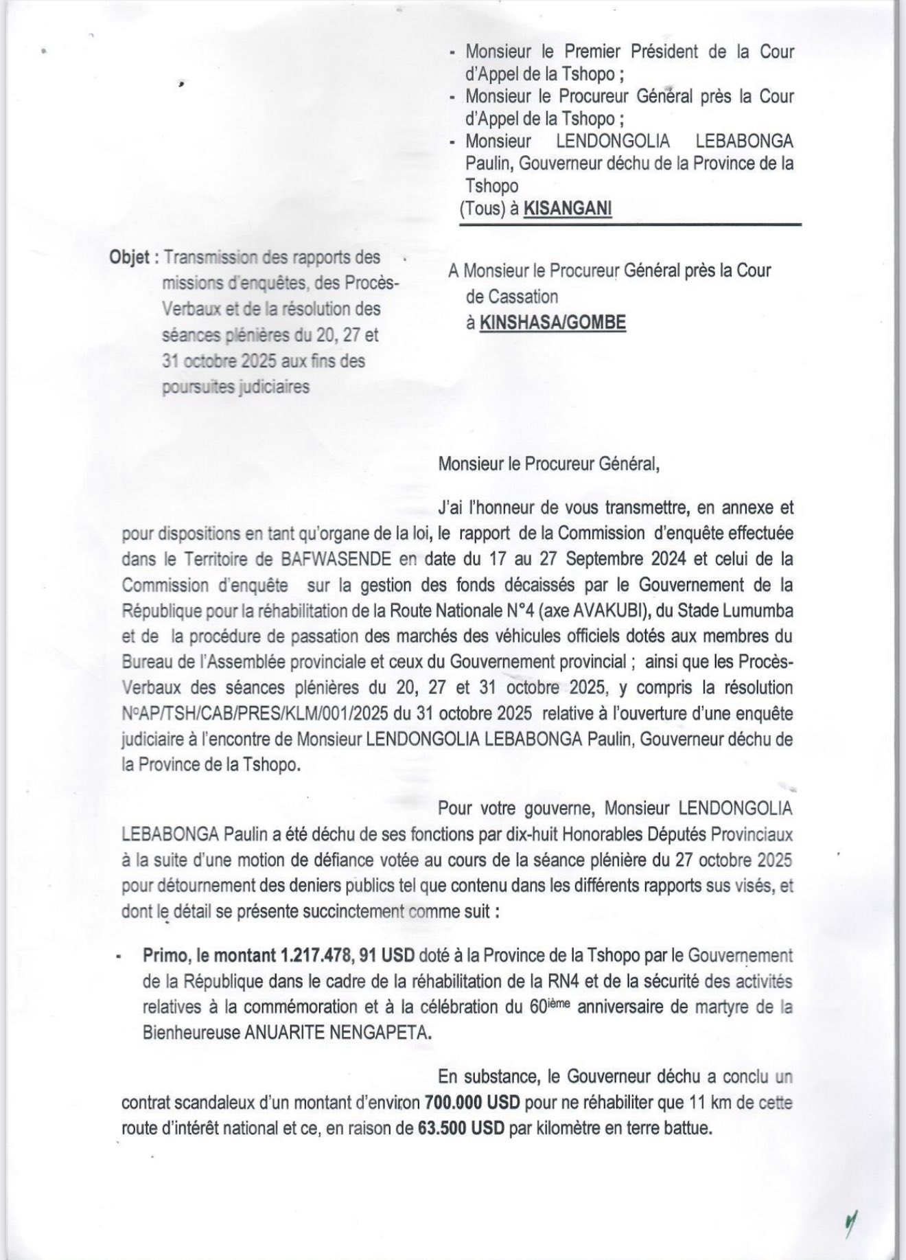Eu égard à ce qui précède et au regard de la gravité des faits évoqués, l’Assemblée provinciale de la Tshopo a résolu, au cours de la séance plénière du 31 octobre 2025, de soumettre l’examen de ce dossier au procureur général près la cour de cassation pour s’attendre à l’ouverture d’une enquête judiciaire à charge de Lendongolia.