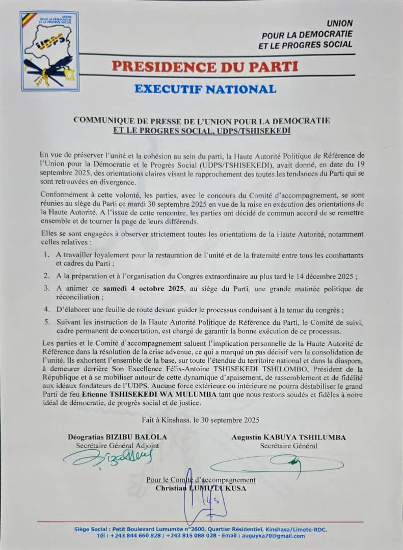 En conflit de leadership, depuis plusieurs mois, Augustin Kabuya et Déo Bizibu, deux secrétaires généraux de l’Union pour la Démocratie et le Progrès Social (UDPS), se sont affichés, ce mardi 30 septembre 2025, main dans la main au siège du parti, une séquence qui annonce la réconciliation au sein du parti au pouvoir.